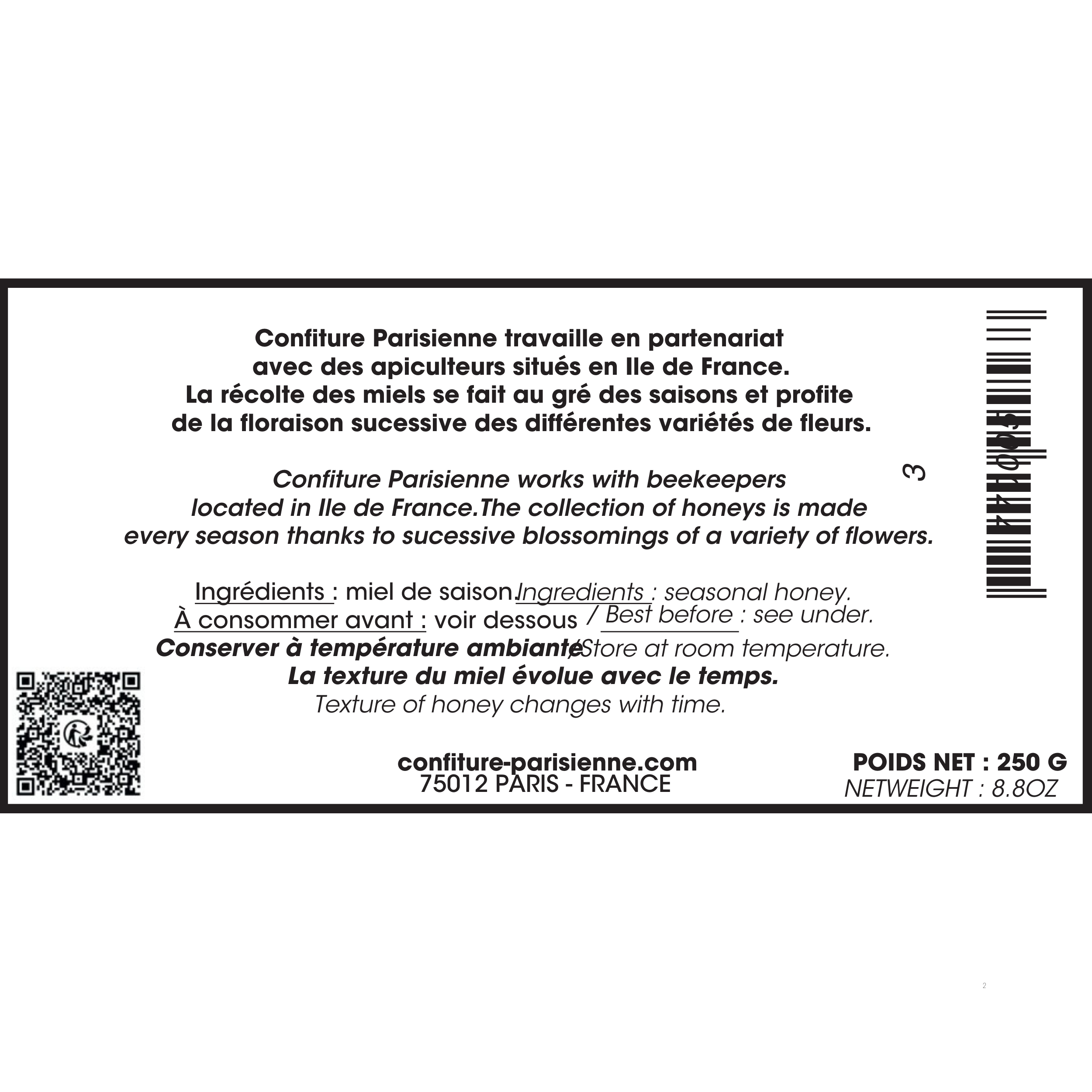 Les abeilles y butinent une grande diversité de fleurs urbaines, donnant naissance à un miel doux, harmonieux et à la texture fondante. Un miel subtil et lumineux, à l’image de son quartier.