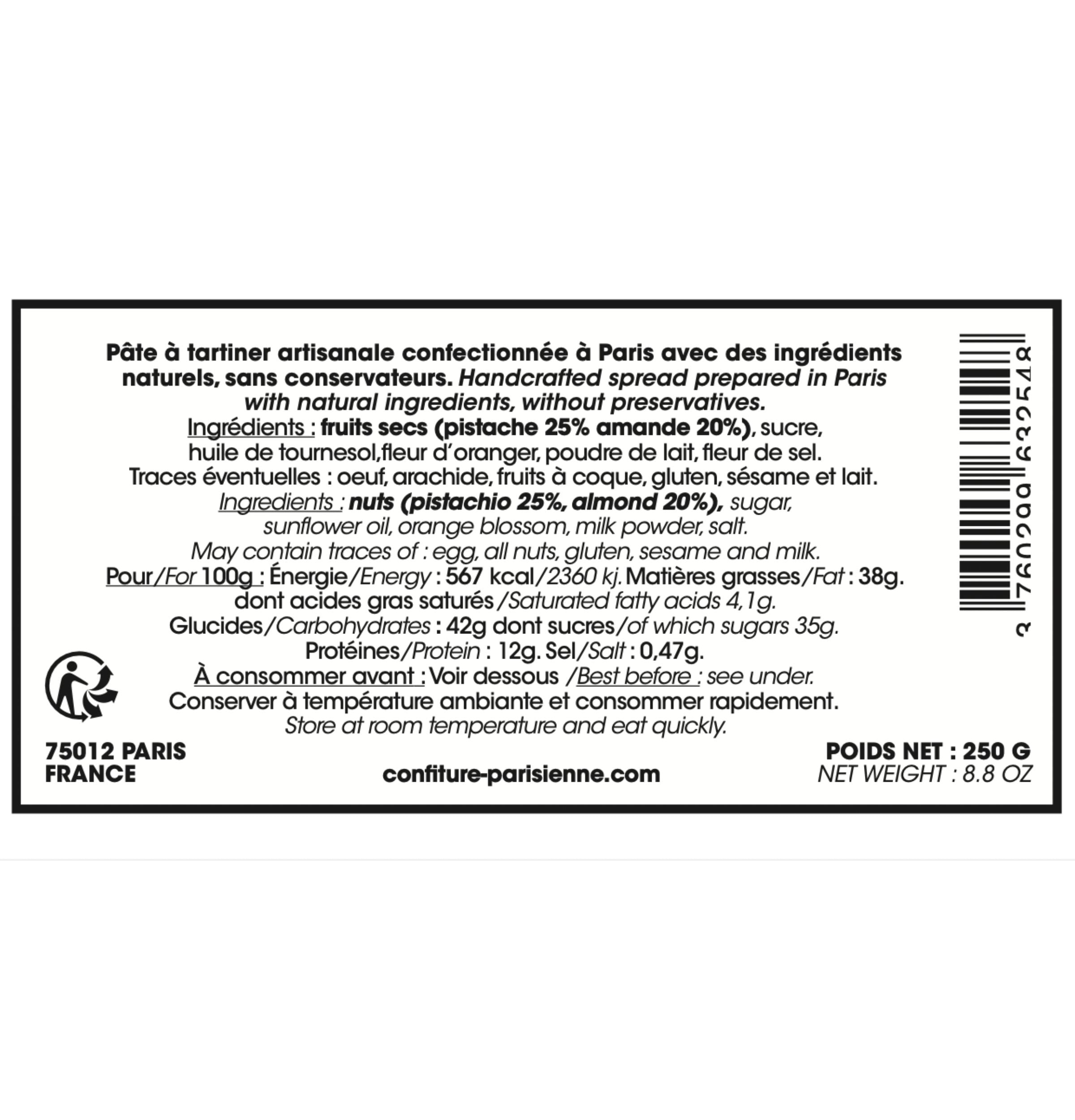 Avec 25% de pistaches et 20% d'amandes, soit un total audacieux de 45% de fruits secs, cette recette se distingue nettement du reste du marché. Oubliez les règles, plongez directement dans cette crème dense aux amandes et pistaches d’Espagne, relevée d’un souffle de fleur d’oranger et d’une insolente pointe de fleur de sel.